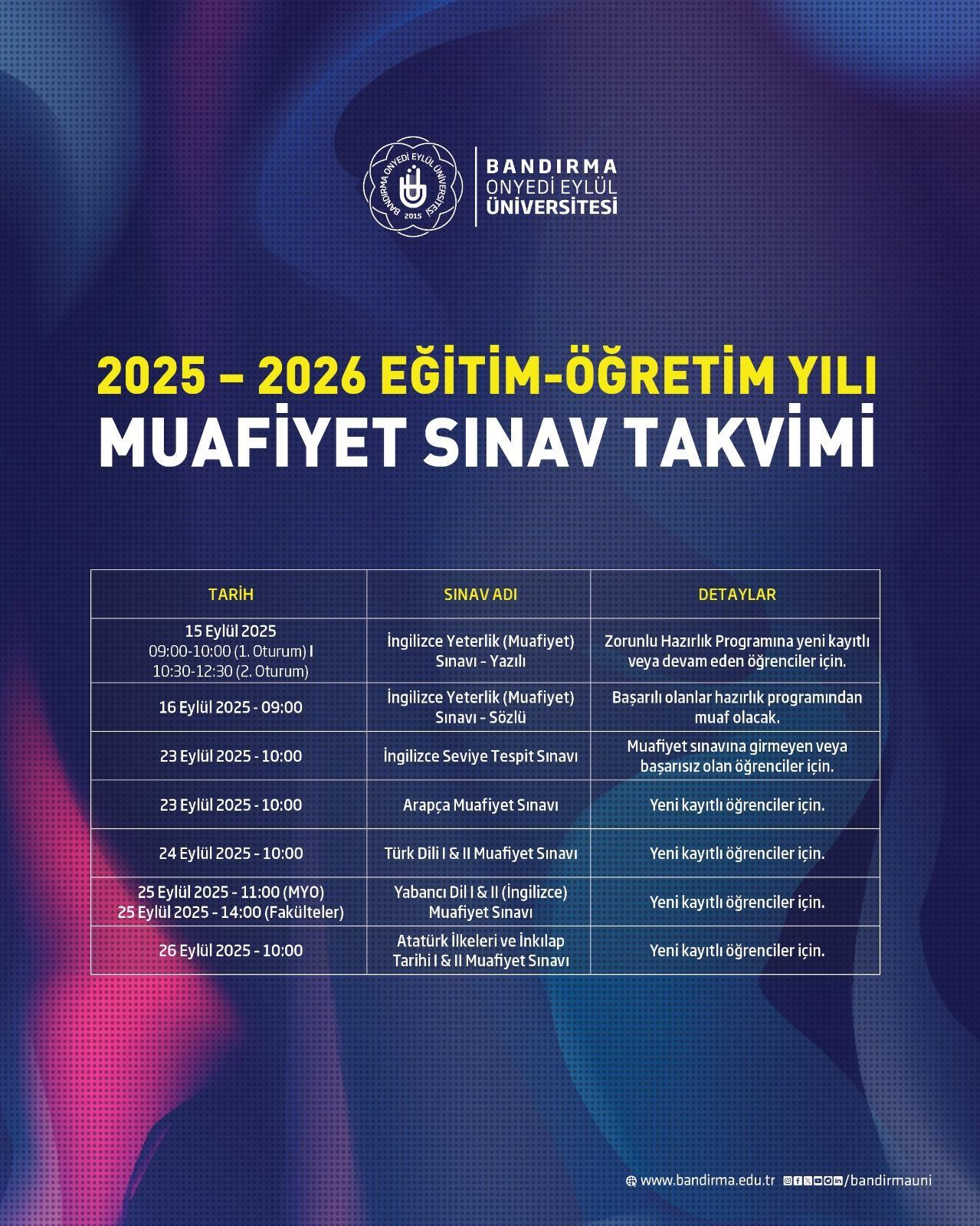 Üniversitemizde 2025 – 2026 Eğitim-Öğretim Yılı kapsamında gerçekleştirilecek muafiyet sınavlarının tarihleri ve başvuru koşulları aşağıda yer almaktadır.