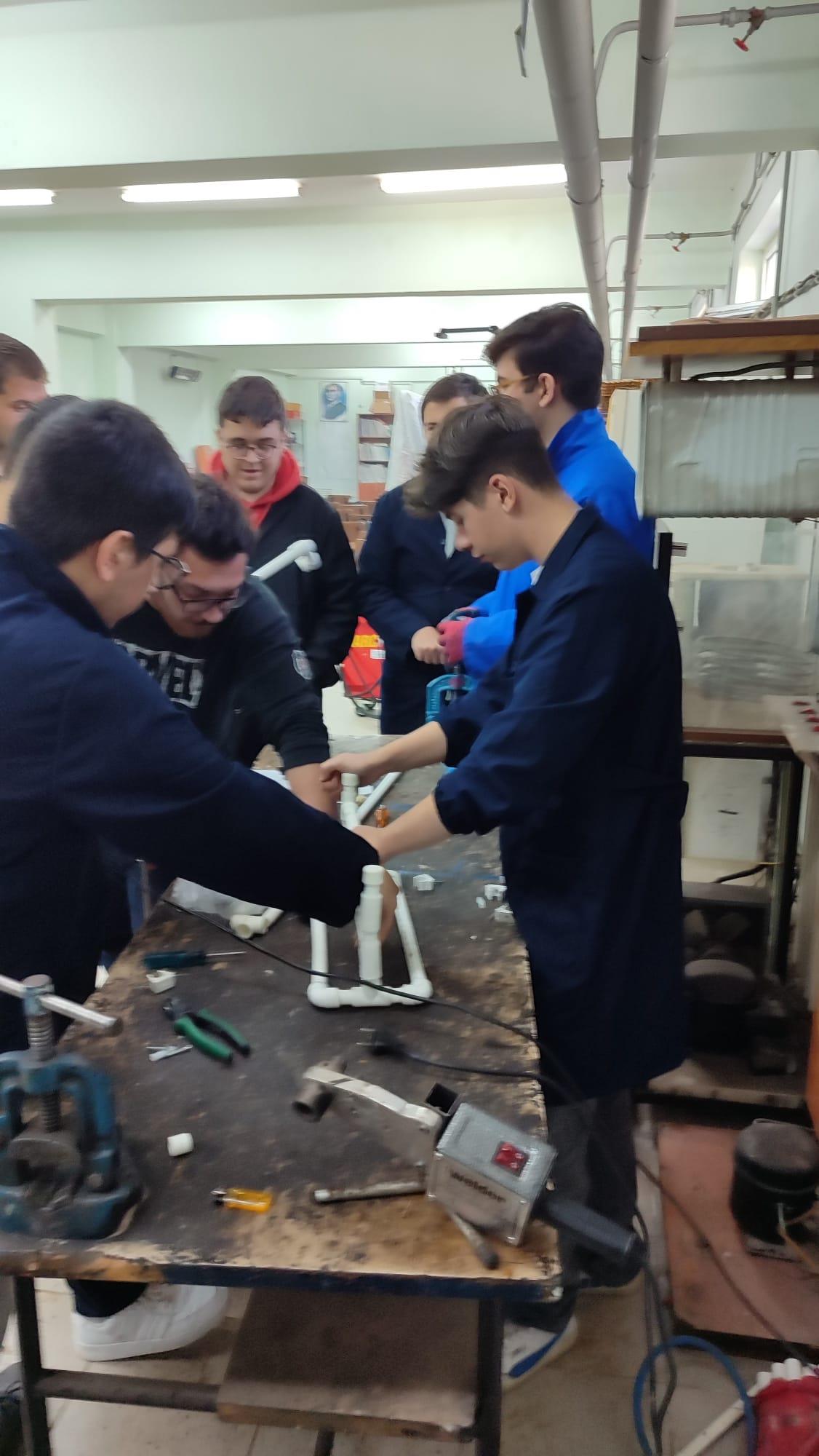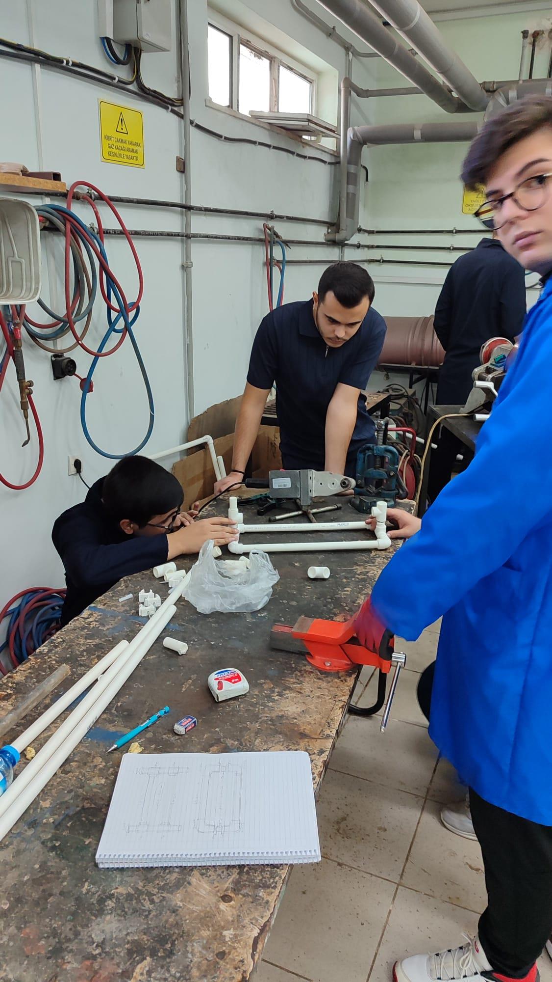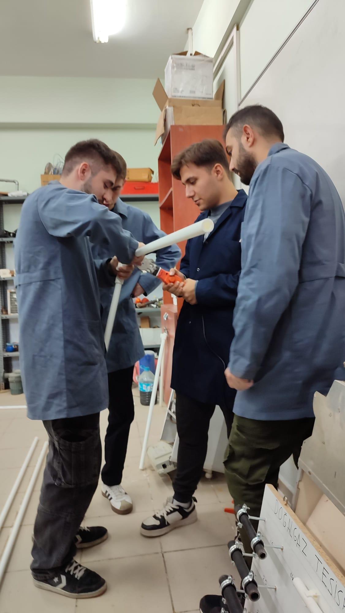 Temel Tesisat İşlemleri dersi kapsamında, Öğr. Gör. Dr. Bülent Gedik nezaretinde öğrenciler PPRC borularda ölçü alma, kesme, füzyon kaynağı yöntemiyle montajlama ve test alma uygulamaları gerçekleştirmektedir. Bu çalışmalar, öğrencilerin tesisat sistemlerinin temel ilkelerini uygulamalı olarak öğrenmelerini, doğru ölçülendirme, birleştirme ve sızdırmazlık tekniklerini geliştirmelerini amaçlamaktadır. Uygulamalar sırasında iş sağlığı ve güvenliği kurallarına uygun çalışma alışkanlıklarının kazandırılması da öncelikli hedefler arasındadır. Böylece öğrenciler, standartlara uygun, güvenli ve verimli tesisat montajı becerileri edinmektedir.