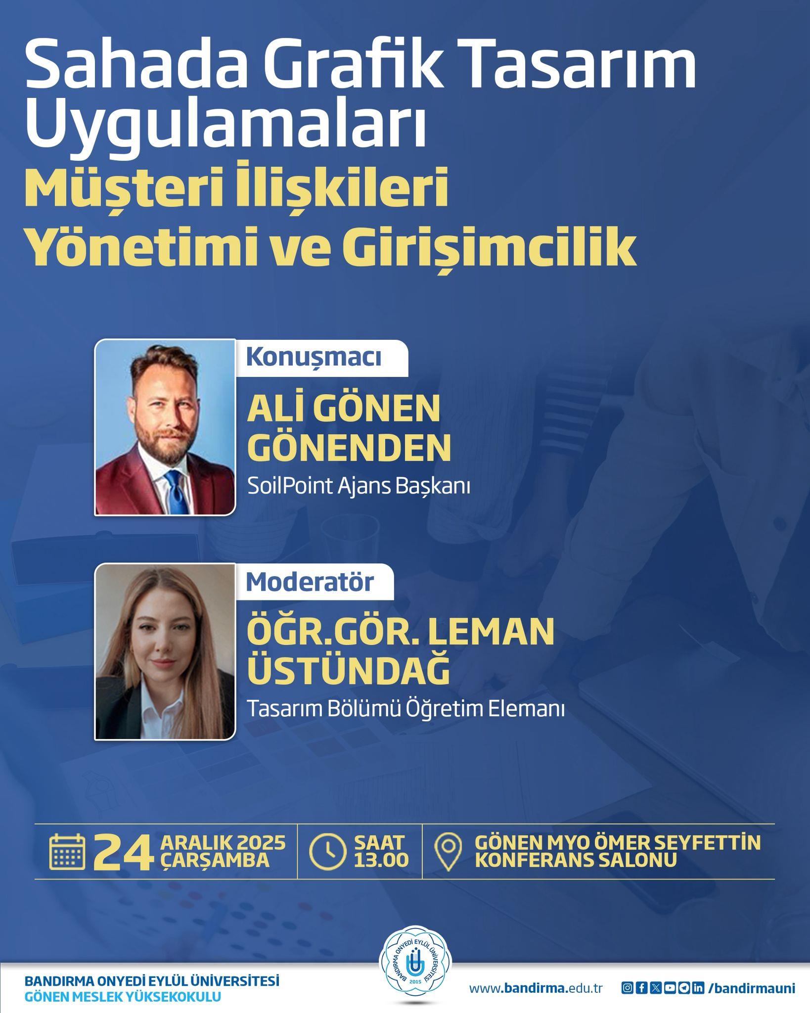 Gönen Meslek Yüksekokulu tarafından, “Sahada Grafik Tasarım Uygulamaları, Müşteri İlişkileri Yönetimi ve Girişimcilik” başlıklı bir söyleşi düzenlenecek.