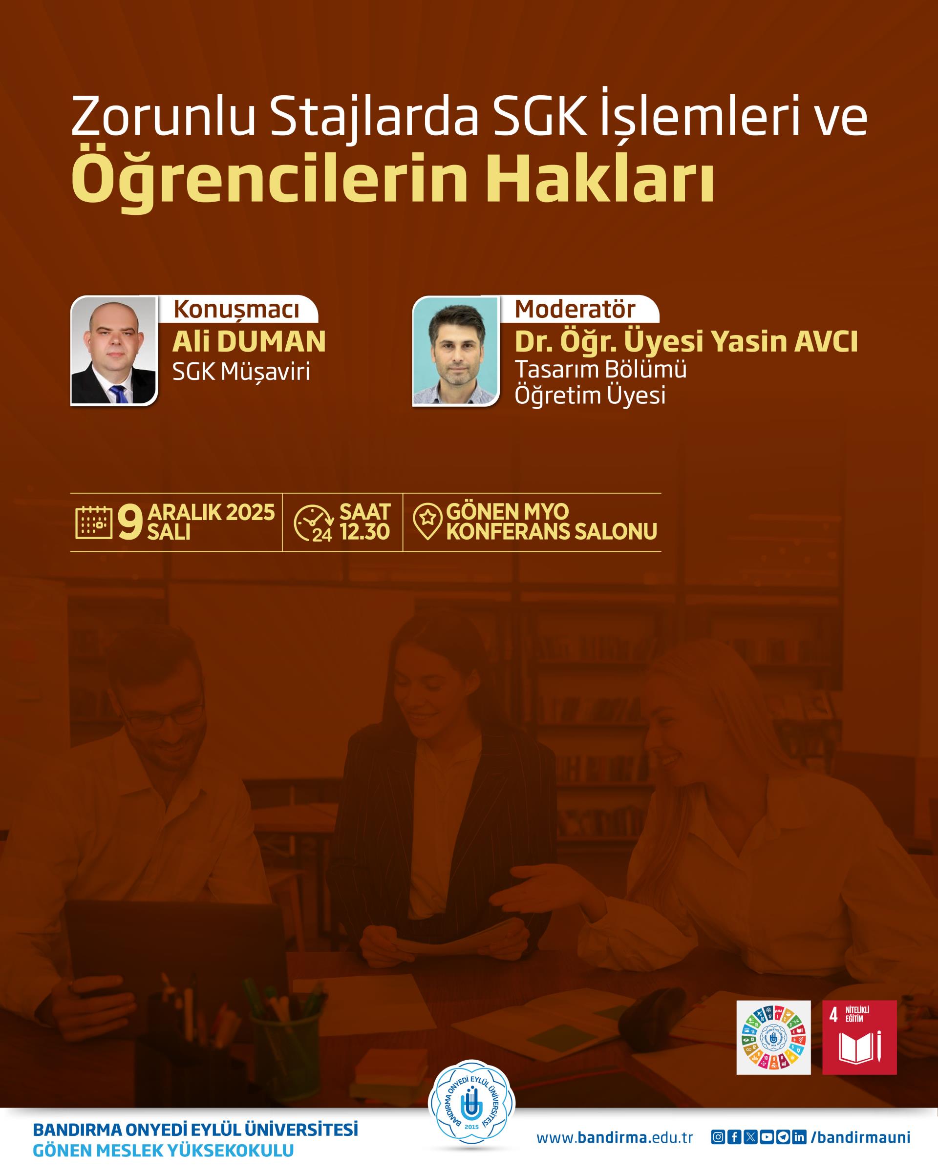 Zorunlu Stajda SGK İşlemleri ve Öğrencilerin Hakları konulu söyşeşi etkinliği 9 aralık 2025 salı günü gerçeklerştirilecektir.
