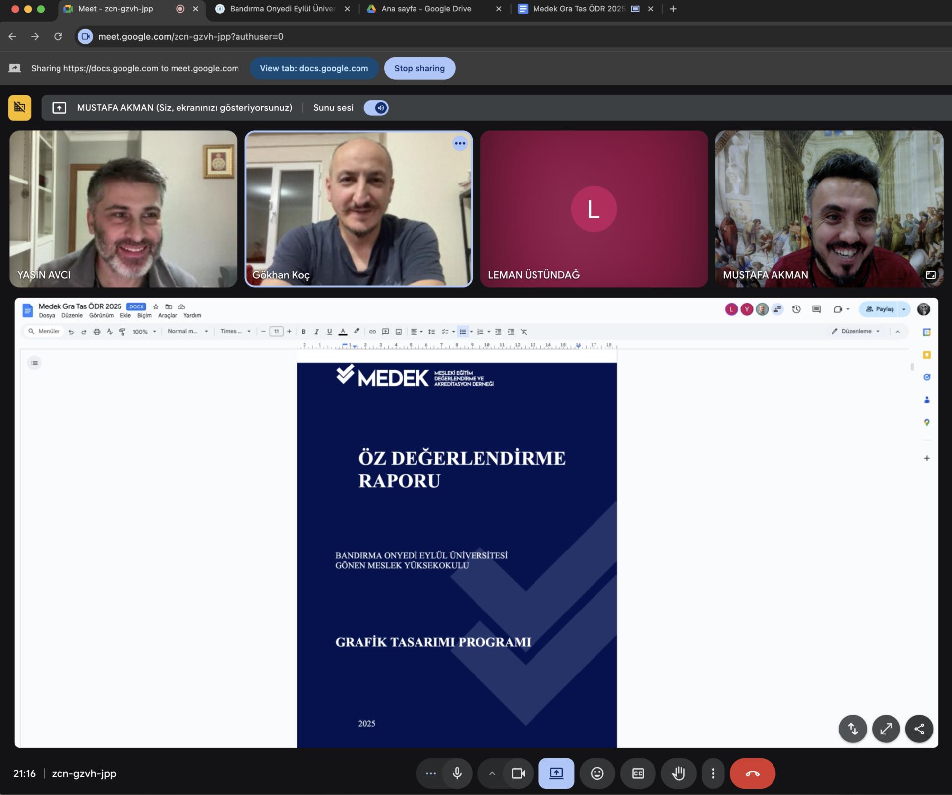 Gönen Meslek Yüksekokulu Tasarım Bölümü Grafik Tasarımı Programı öğretim elemanlarının katılımıyla 16.10.2025 tarihinde, öz değerlendirme raporu kapsamında çevrim içi bir toplantı gerçekleştirildi. Toplantıda, MEDEK (Mesleki Eğitim Değerlendirme ve Akreditasyon Kurulu) standartları doğrultusunda hazırlanan mevcut rapor incelendi ve gerekli güncellemelerin yapılması amacıyla revize sürecine başlandı. Katılımcılar, programın güçlü yönleri ve geliştirilmesi gereken alanlar üzerine görüş alışverişinde bulunarak kalite güvencesi sistemine katkı sağlayacak öneriler geliştirdiler. Bu çalışma ile Grafik Tasarımı Programı’nın, akreditasyon sürecinde sürdürülebilir kalite anlayışını güçlendirmesi hedeflenmektedir.