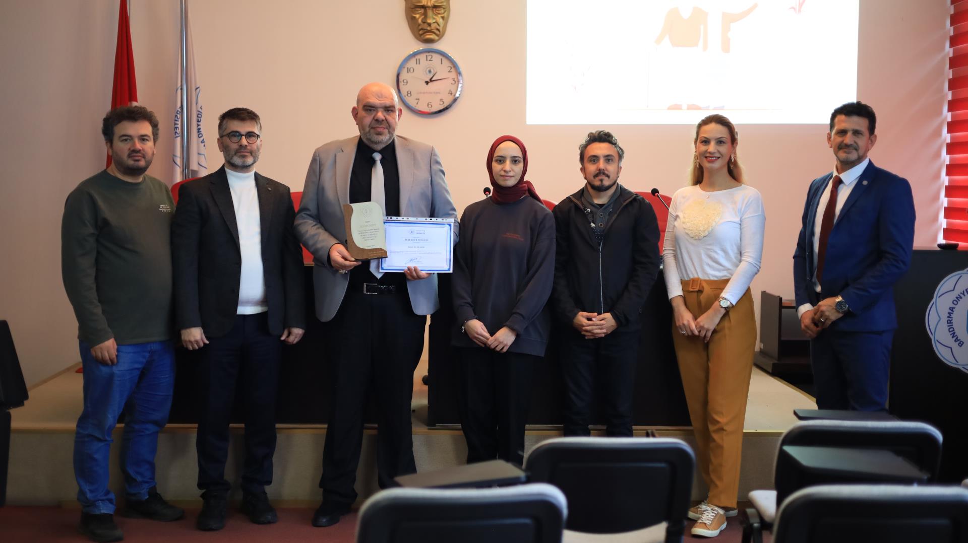 Etkinlik, Yüksekokul Müdür Yardımcısı Doç. Dr. Emine Yalur tarafından Ali Duman’a plaket takdim edilmesiyle devam etti ve akademik–idari personelin de yer aldığı hatıra fotoğraflarının çekilmesiyle tamamlandı. Öğrencilerin yoğun ilgi gösterdiği söyleşi, Gönen Meslek Yüksekokulu’nun sektörle iş birliğine verdiği önemi ve öğrencilerine güncel, uygulanabilir bilgiler sunma misyonunu bir kez daha ortaya koymaktadır.