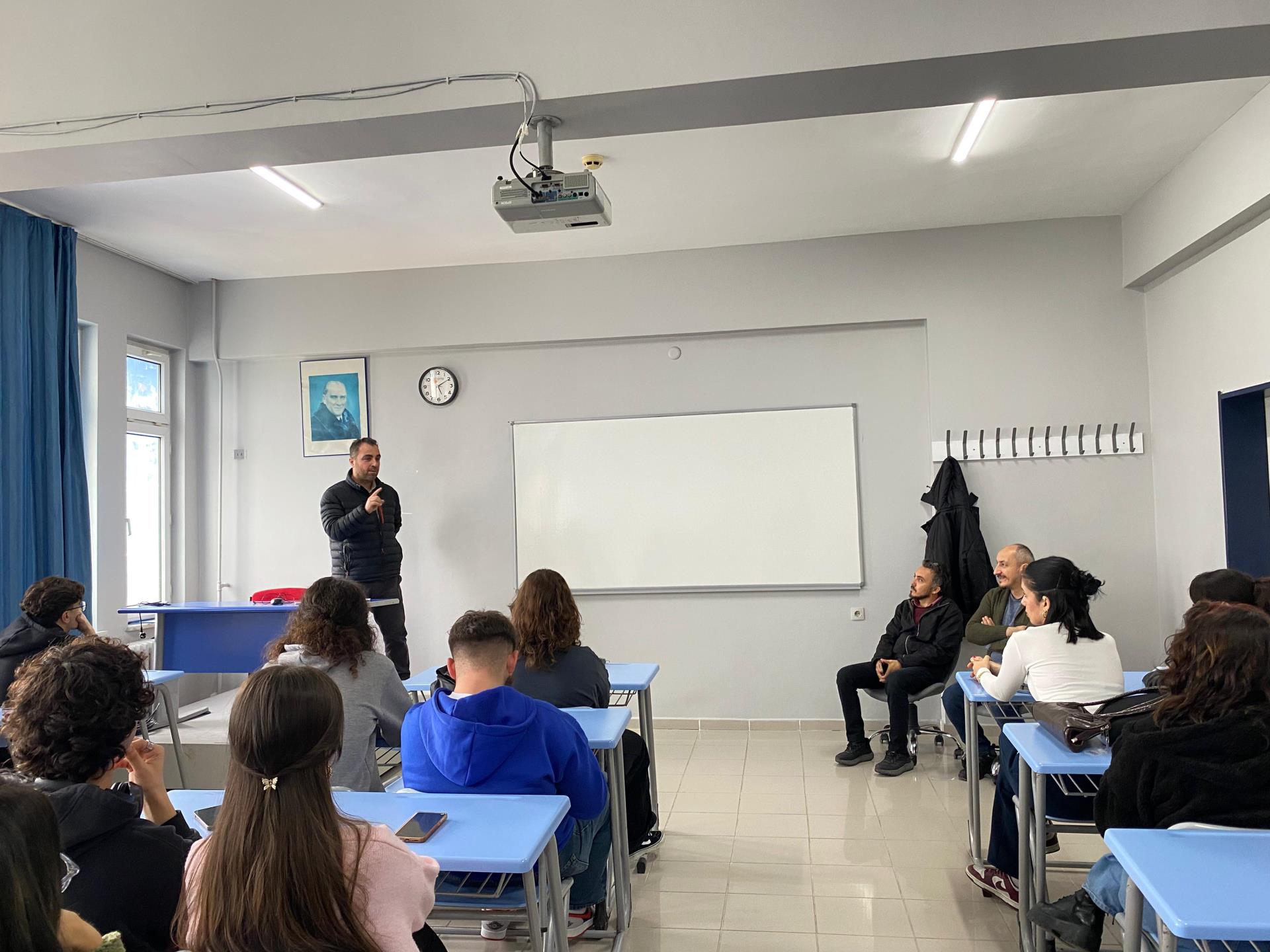 “Ustalarla Sektör Buluşmaları” kapsamında düzenlenen söyleşide Abdullah Uyar, grafik tasarım sektöründeki güncel iş akışlarını, ajans deneyimlerini ve sektörde beklentilerin nasıl şekillendiğini öğrencilerle paylaştı. Program boyunca gerçek projelerden örnekler vererek, öğrencilerin mesleki farkındalıklarını geliştirmeye yönelik önemli açıklamalarda bulundu. Etkinliğin soru–cevap bölümünde ise, portfolyo hazırlığından müşteri iletişimine, sektörün dijital dönüşümünden iş süreçlerinin yönetimine kadar birçok konuda merak edilen sorular cevap buldu. Uyar, bu bölümde daha spesifik noktalara değinerek öğrencilere profesyonel hayata hazırlık konusunda değerli bilgiler sunarak gerçek hayat deneyimini okula sıralarıyla paylaştı.