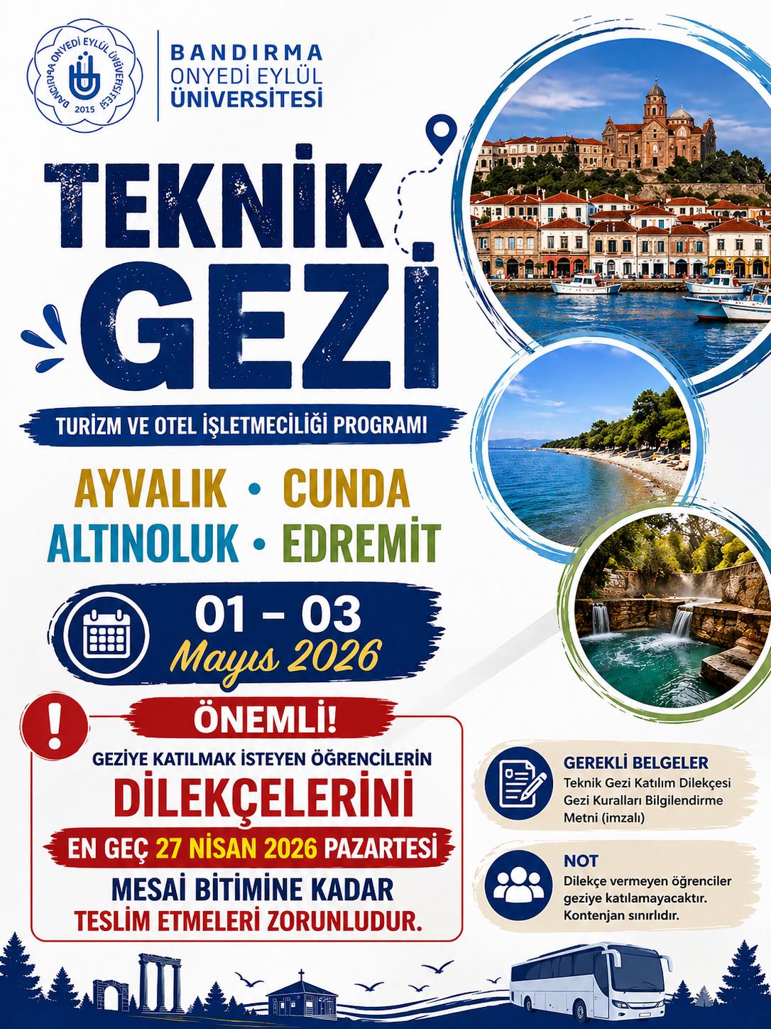 Bandırma Onyedi Eylül Üniversitesi Gönen Meslek Yüksekokulu Turizm ve Otel İşletmeciliği Programı kapsamında, öğrencilerin mesleki bilgi ve deneyimlerini artırmak amacıyla 01–03 Mayıs 2026 tarihleri arasında Ayvalık, Cunda, Altınoluk ve Edremit destinasyonlarını kapsayan teknik gezi düzenlenecektir.