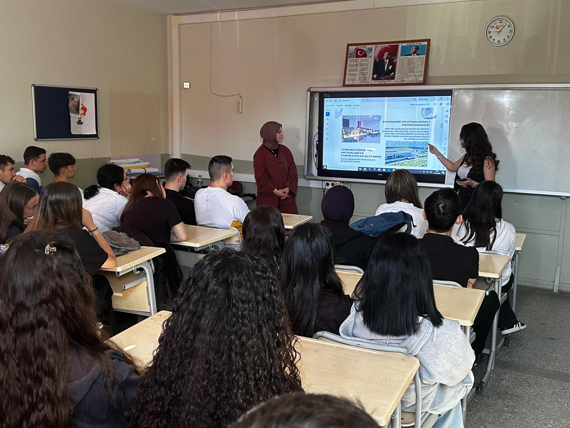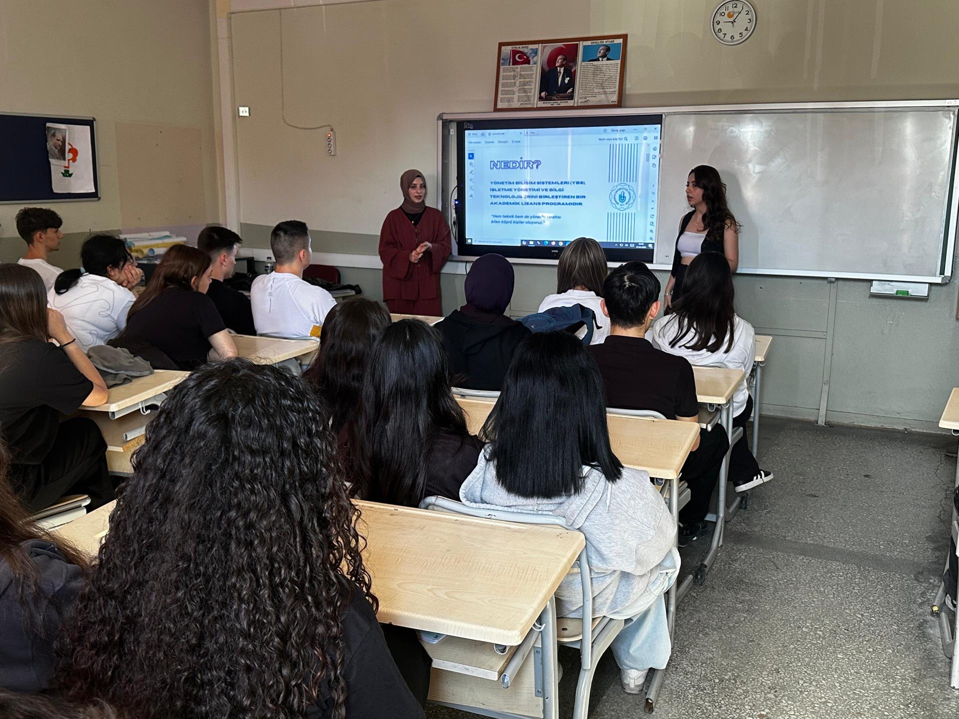 Bölüm temsilcileri olarak görev alan 4. sınıf öğrencilerimiz Şevval BENLİ ve Kübra AYDEMİR tarafından yapılan sunumda; YBS'nin temel yapısı, sunduğu kariyer olanakları, günümüz iş dünyasındaki konumu ve gelecekte üstleneceği rol detaylı biçimde aktarılmıştır. Öğrencilere ayrıca bölümün sunduğu staj imkânları, yazılım geliştirme ve veri analitiği gibi uygulamalı eğitim fırsatları hakkında bilgi verilmiş; etkinlik süresince öğrencilerden gelen sorular yanıtlanarak mesleki yönelimlerini şekillendirme aşamasındaki gençlere rehberlik edilmiştir.